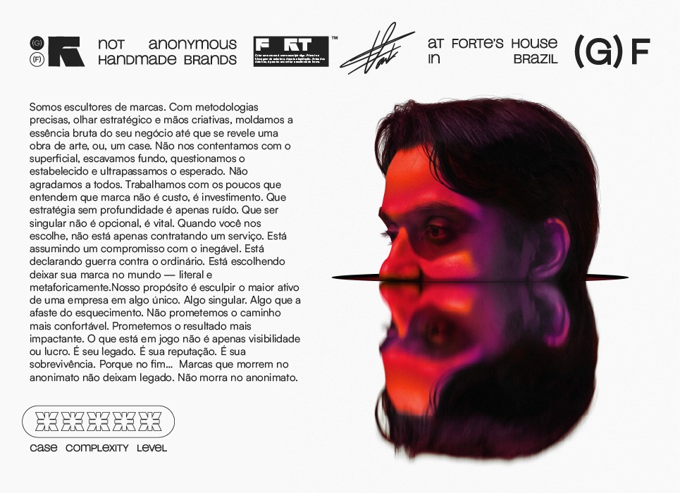 Algumas marcas precisam de uma fundação. Outras, de um redirecionamento. Para ambos os casos, existe a consultoria Forte. Este é o espaço onde realizamos intervenções precisas — diagnósticos cirúrgicos, mapeamentos de oportunidades, reposicionamento, expansão de territórios e decisões de marca que exigem profundidade. É o braço crítico e reflexivo da Forte: menos forma, mais direção.
